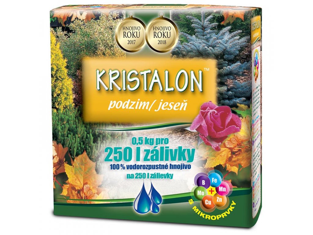 KRISTALON Podzim je speciální krystalické, vodorozpustné ES hnojivo, které díky vysokému obsahu draslíku podporuje lepší vyzrávání pletiv a bezproblémové přezimování rostlin, chrání před vymrzáním. Podzimní hnojivo je určeno pro jahody, okrasné dřeviny, růže, ovocné stromy a keře - angrešt, maliny, ostružiny, vinná réva, rybíz a další.